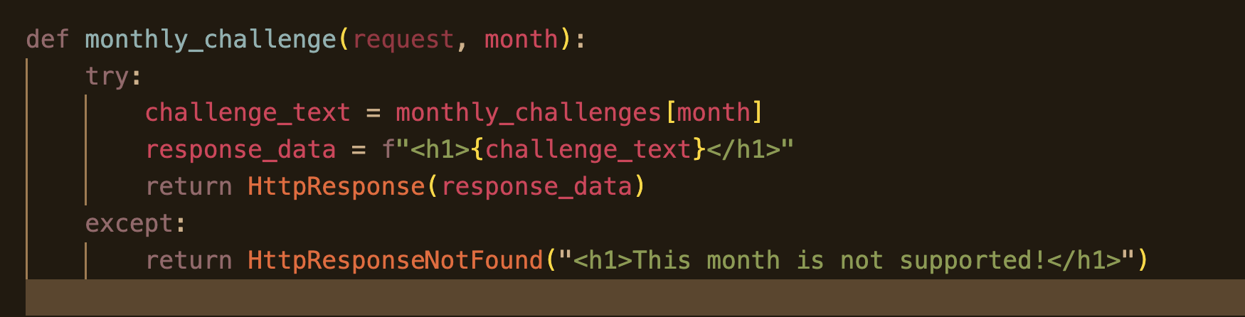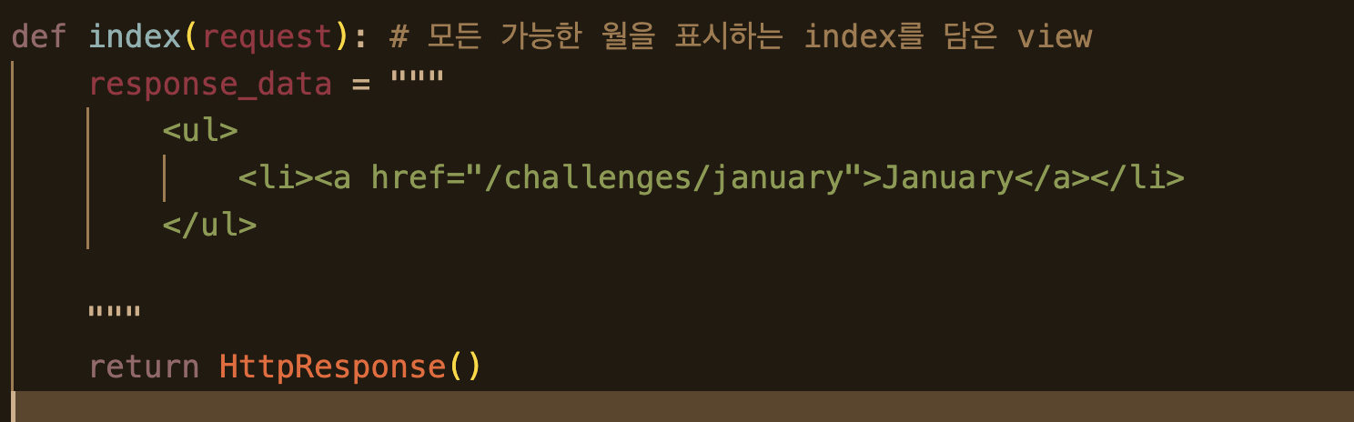 즉, monthly_challenges라는 딕셔너리의 key 값들을 하나씩 반복문으로 순회하면서, 해당 key(월 이름)를 <li> 태그로 감싸고, 그것을 하나의 문자열에 계속해서 추가하는 방식이다.