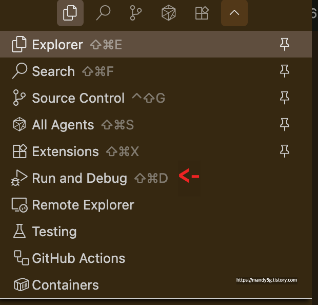 vscode에서 더보기를 눌러서 run and debug를 선택한다.