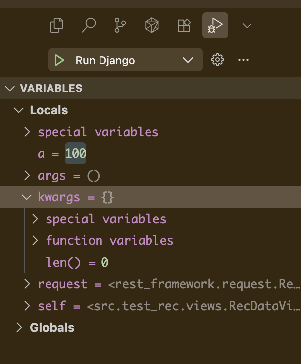 breakpoint를 찍은 다음에 Run Django를 하면 해당 break point를 찍은 부분이 나오는 것을 알 수 있다. (이후는 파이썬 디버깅과 동일)