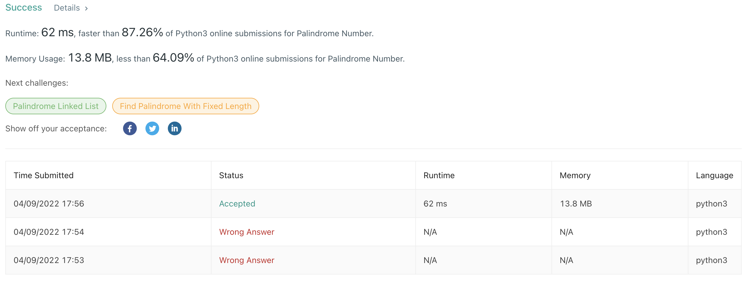 이 문제에서 주의해야 할 것은 음의 정수가 포함된다는 것이다! -121을 바꿔면 121-이므로 Palinedrome 숫자가 아니다. (설명도 적어야 한다.)