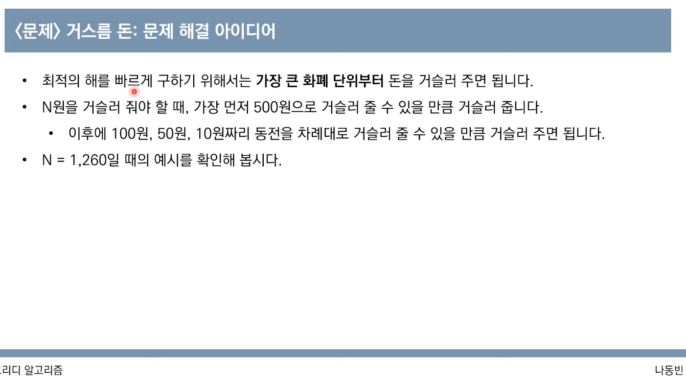 - 가지고 있는 동전 중에서 큰 단위가 항상 작은 단위의 배수이므로 작은 단위의 동전들을 종합해 다른 해가 나올 수 없기 때문