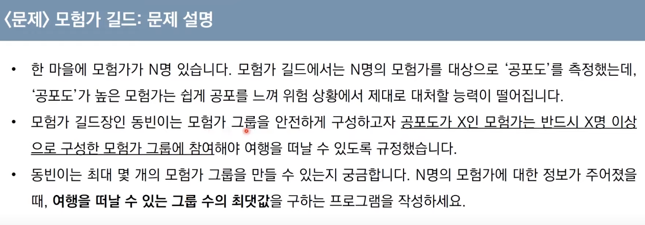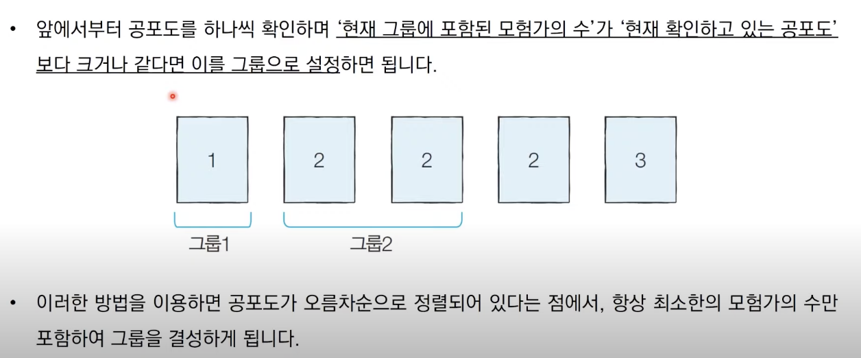 if count >= i: # 현재 그룹에 포함된 모험가의 수가 현재의 공포도 이상이라면, 그룹 결성: 1, 1 -> 1, 2 -> 2, 2 -> 1, 2 -> 2, 3